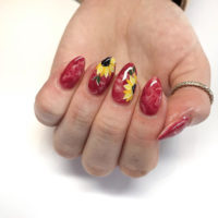 Begin the week the right way with some nail inspiration this mani Monday! A sunflower is enough to brighten anyone’s day and this nail design is certainly brightening ours here at Scratch HQ. This design comes courtesy of talented tech, Laura Easby, and features a marbled autumn-ready red wine hue alongside hand painted sunflowers on the middle…