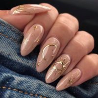 We want to see what you’re wearing on your nails! Talented tech, Terri Eaton, wears nude almond nails finished with gold celestial detailing. “I love all celestial things so the idea of suns, moons and stars on my nails are a dream. I saw some inspo from another tech on Instagram (@gaudyoctopus) and decided to give it…
