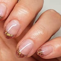 We want to see what you’re wearing on your nails! Talented tech, Hayley McCabe, wears a sparkling golden glitter French. “I have had short nails for a while and so sculpted enhancements using the Lecenté Create Builder Gel. I added one coat of CND Shellac in Negligee and encapsulated Lecenté Peru Glitter in the tips…