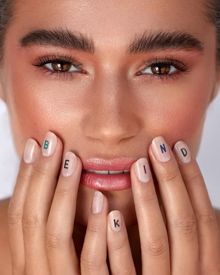 The nail look for the shoot was subtle, allowing the lettering to make a statement. “I started by filing the model’s nails,” explains Ivana. “I then manicured and polished her nails using CND Vinylux™️ in Bouquet. I applied two thin layers and finished the look with CND Vinylux™️ Gel-Like Effect Long Wear Top Coat. Just before we started with the shoot then I placed the letters to form the phrase ‘Be Kind’ across the nails.