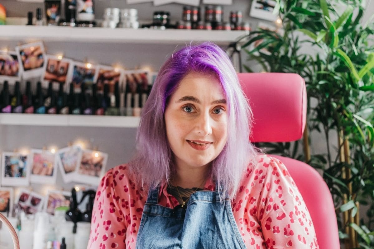 Moving onto nails after changing her career path due to illness, Lucy shares, “I became debilitatingly ill in 2012 and was forced to stop working in my previous careers as a graphic designer/illustrator & florist. I physically couldn’t work for the next six years as I was so ill and my mental health suffered as a result. After getting my own nails done in an NSS salon for a holiday (I’m sorry), and being horrified at the state of the nails and overall experience, I spent the entire holiday researching reputable professional brands and training courses. Two weeks after I got back from my holiday, I started my Bio Sculpture training! I knew exactly what type of nail services I wanted to offer and felt that Sheffield was missing it. I wanted to specialise in nail art and gel nails (to be free of the sometimes overwhelming monomer smell of nail salons), offering fully vegan nail services and run as ethically and low-waste as possible. I started working part-time as a mobile nail tech, which lasted about nine months until I couldn’t physically carry my kit around with me anymore. I rented a desk in a friend’s hair salon for around a year and grew my client base. I did further training with INK London in UV/LED hard gel, e-file and acrygel, and then in the first lockdown I took the plunge and got my own studio space, despite not knowing how things would turn out due to the pandemic. It was the best decision I ever made! The studio is on the first floor of a former industrial building in a rapidly evolving area of Sheffield called Kelham Island and was being used as a meeting and store room before I took the space over.”
