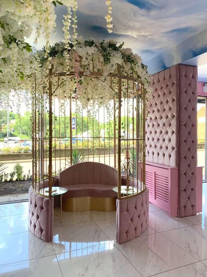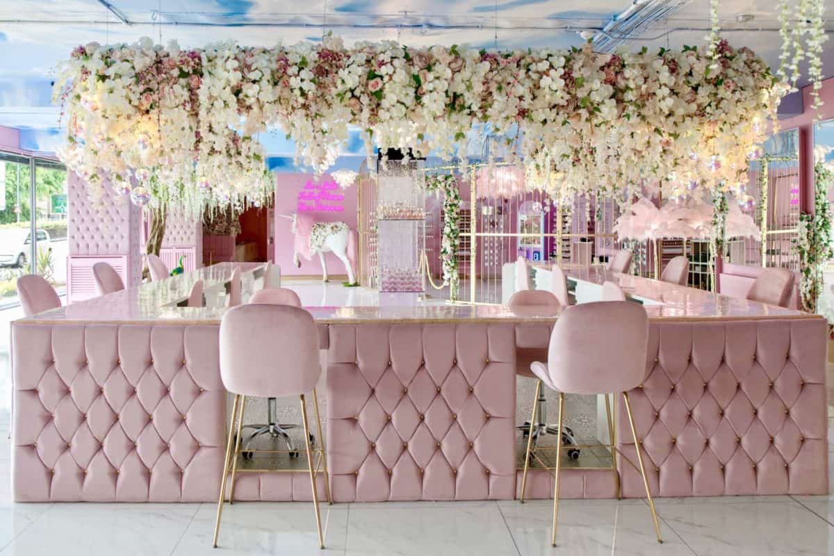 Every tiny detail in the salon has been analysed and thought out by Annabel and Elliott, from the handcrafted flowers to the birdcage-inspired structures. Marble lines the floors of the main salon space, as well as making an appearance on coffee tables and the salon’s central feature – the nail bar. Plush baby pink buttoned material cascades down the sides of the nail bar and lines the sofas that offer a soft, welcoming place to relax pre and post treatment. Nods to nature can be found in every corner of the salon, as blossom trees and flowers flow overhead and spray painted roses line the walls, while Annabel’s love of animals is also prominent in the form of a fish tank, a peacock sculpture and life size unicorn – of course, complete with a pink mane and crystal-encrusted horn, hand placed by Annabel. A golden bird cage-inspired structure separates the nail area and the Nails by Annabel product shop, where techs can come in and purchase their favourite Glitterbels products.