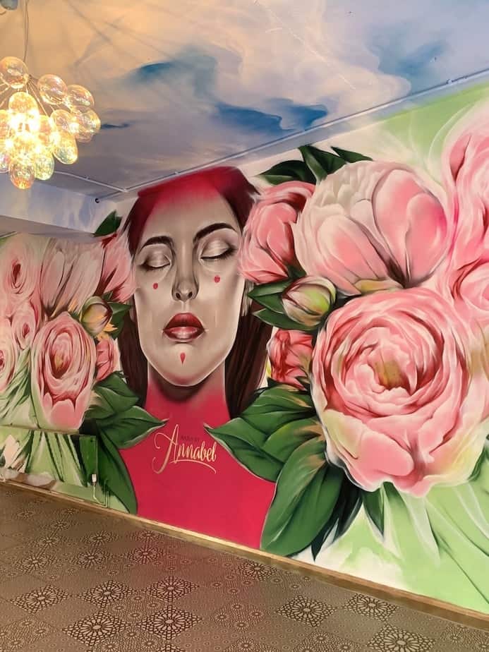 Walk into the grand space – which was previously a car showroom, to give you a sense of the sheer size – and its as though you’re looking through baby pink-tinted lenses as you are immediately greeted with views of a nail wonderland. However, this pink palette is perfectly contrasted by the presence of custom spray painted walls in the individually designed bathrooms, cloudy sky ceiling and graffiti-style portrait covering the entire left wall of the entrance. There is a flawless balance of ‘girly’ and ‘edgy’ throughout the whole salon; reflecting Annabel’s personality.