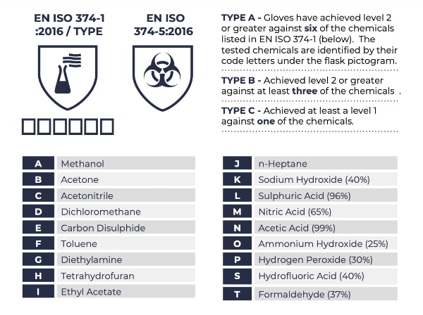 Chemically protective clothing such as gloves must be able to withstand the permeation of chemicals in order to be considered chemical-resistant. Testing is carried out on a wide range of materials and products to the requirements specified in EN ISO 374-1 (chemical requirements for gloves) to determine which gloves give chemical resistance against which substances.