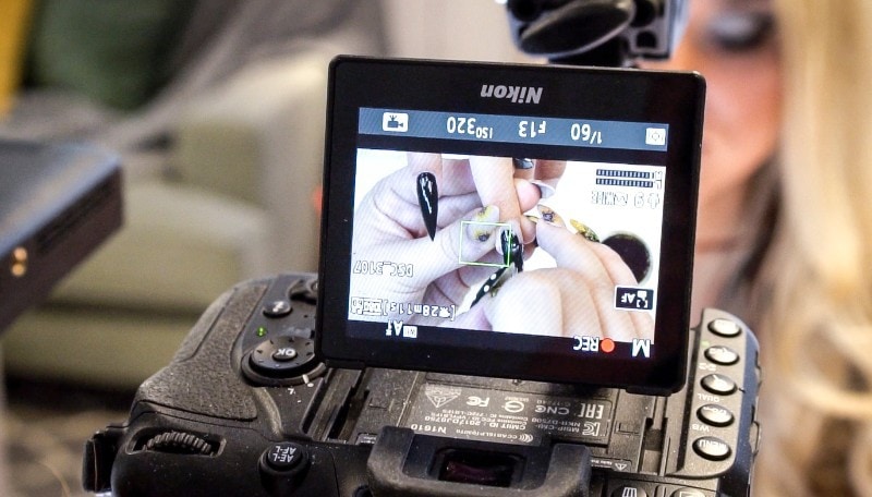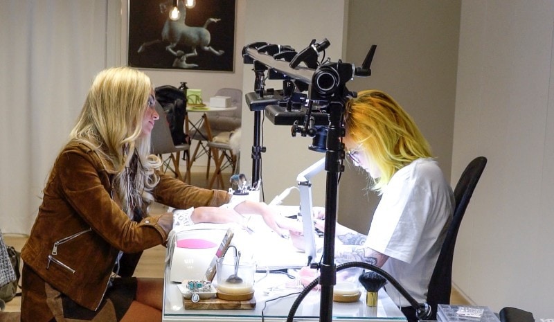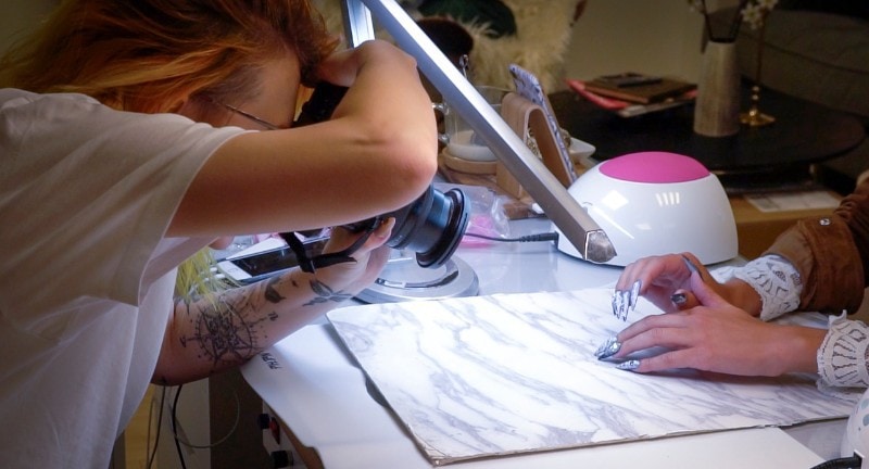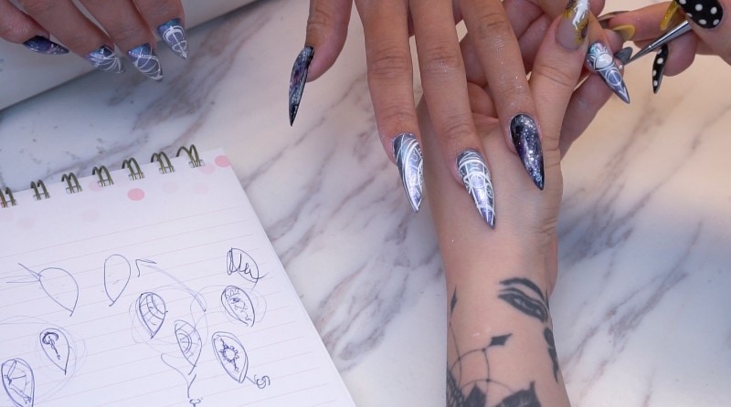 Celina drafted the nail design in her sketchbook just the day before the photo shoot and crafted it over five hours using Light Elegance products and Swarovski embellishments. In the relaxed setting of her studio space, Celina led the shoot direction and photography while her boyfriend, Christian, collated behind-the-scenes footage.