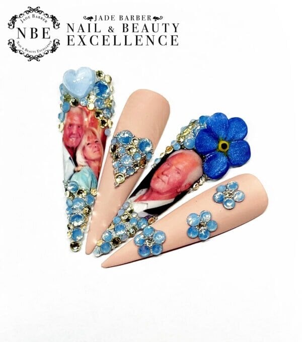 I wished to include their pictures in the nail design to make it personalised, so I asked nail tech, Rachel Hanks, to create decals of my grandparents. I used Nail & Beauty Excellence products for the rest of the design, including Gel Excellence gel polishes and art gels. The forget-me-not flower was created using L&P acrylic, representing that although my grandad’s memory has gone, the true him will not be forgotten.