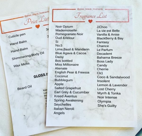 Gloss Beauty Treatments offers a range of cuticle oils with designer-based fragrances as well as fruity scents and some of Ciaran’s favourites.