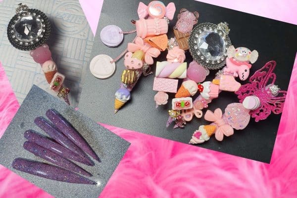 “Nana gave me some ideas of the look to be fashioned, so I had a blueprint to build from. This included cute candy colours with OTT bling and each on a super long tip. I thoroughly enjoyed making the candy pieces and adding dangling chains, sculpting acrylic love hearts and even a mini gingerbread man. Almost like putting together a jigsaw, each element was placed on the nail tips with every single millimetre of space taken, so that everywhere the eyes fall there’s something fresh and cool to look at. I added huge jewellery charms to the design, which being so large with so many elements, needed to be robust, so if they were knocked, they would not fall off. I secured them all using clear acrylic and then top coated the entire design.”