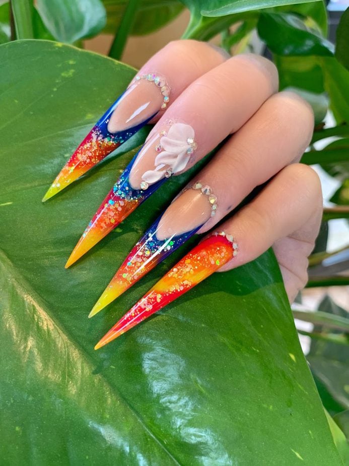 Fav nails style: Long nails; the stiletto shape incorporating themes mixed with the changing of the seasons.
