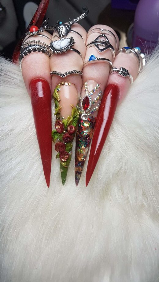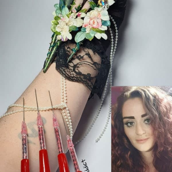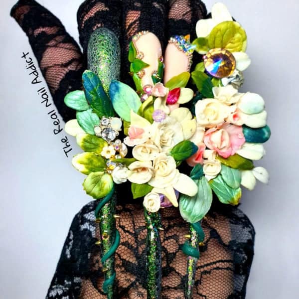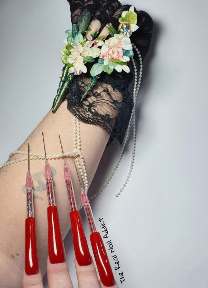 “These nails were created as a symbol of my life story so far. The needles represent the darkest part of my life and the flowers showcase the abundance and growth nails have allowed me to take. I thank the whole nail industry for making me the woman I am today and I’m excited to see where life takes me next. One thing’s for sure, it’s going to be a lot better from here on in.