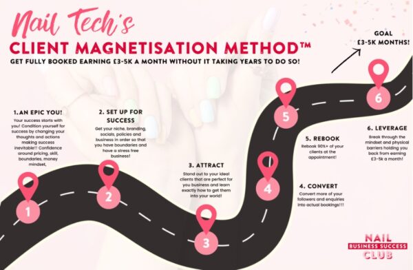 The truth is, earning £3-5k a month as a nail tech is possible for all of us – but it won’t happen by just hoping for a miracle. You need to follow a strategy, such as my six-step Client Magnetisation Method.