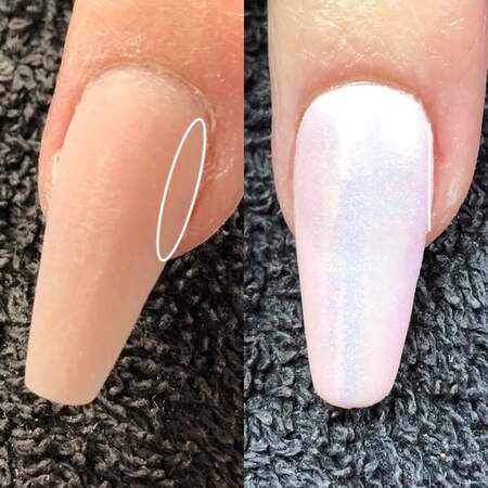 The right nail has a slight roundness and bulging, indicated by the line. The key is not to file down the natural sidewalls and remove strength, but along the side panel as indicated by the circle on the left nail.