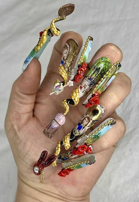 Create a five-nail design that functions like five movements of a musical composition. Each nail should have its own beauty, but the overall design must form a cohesive visual story. Nails can be whatever shape desired, and the minimum length of each should be 5cm from the cuticle area to allow sufficient space for detail.