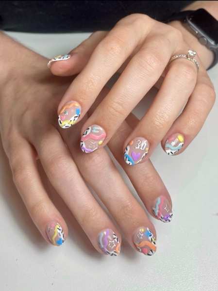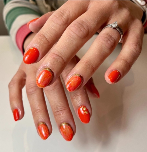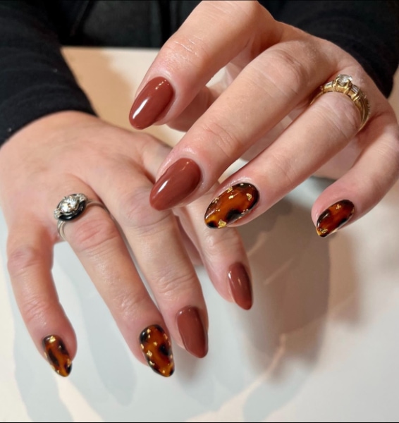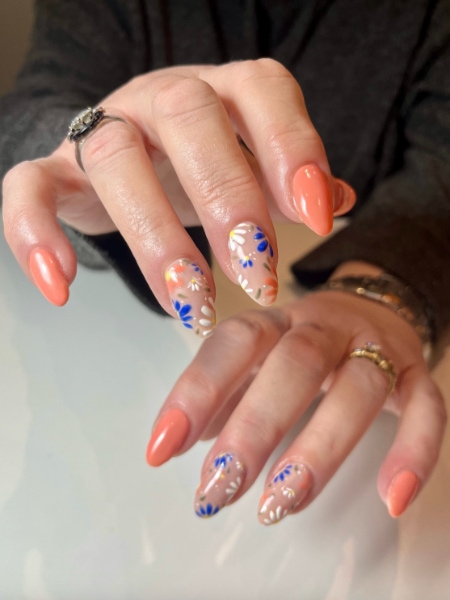 “I can adapt any style my clients have found to put a personal twist on it. Most of my clients go for some form of nail art, whether it be a French tip, florals, animal print or abstract. Clients bring inspiration from art, outfits to match, Pinterest, patterns, fabrics, the seasons, and other techs work that they’ve seen on social media. I also use Manicure Roulette, which is a fab option to open up a range of ideas and styles.”
