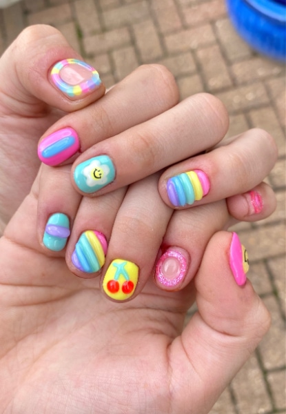 “Looking back at old photos of nails and knowing you did it all by hand is so rewarding,” she enthuses. “Stickers and stencils are always good fun, but nothing beats picking up a brush and giving it a go yourself.”