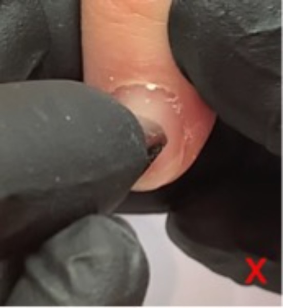 When working with scissors or cuticle pushers, you need to be aware of surrounding tissue, so it is important not to just go in blind with your cutting technique. It isn’t necessary to remove cuticle in one go, however satisfying this may seem. Firstly, identify what needs to be removed, then capture this in-between the blades. It can be ideal to work with curved blades, rather than straight as the sharpest point of the tip of the blades will face away from surrounding skin. When working with curved blades, when ready to cut you can turn the blades upwards so that only what is intended to be removed will be cut as the tip will face upwards, away from surrounding skin.