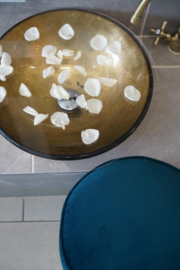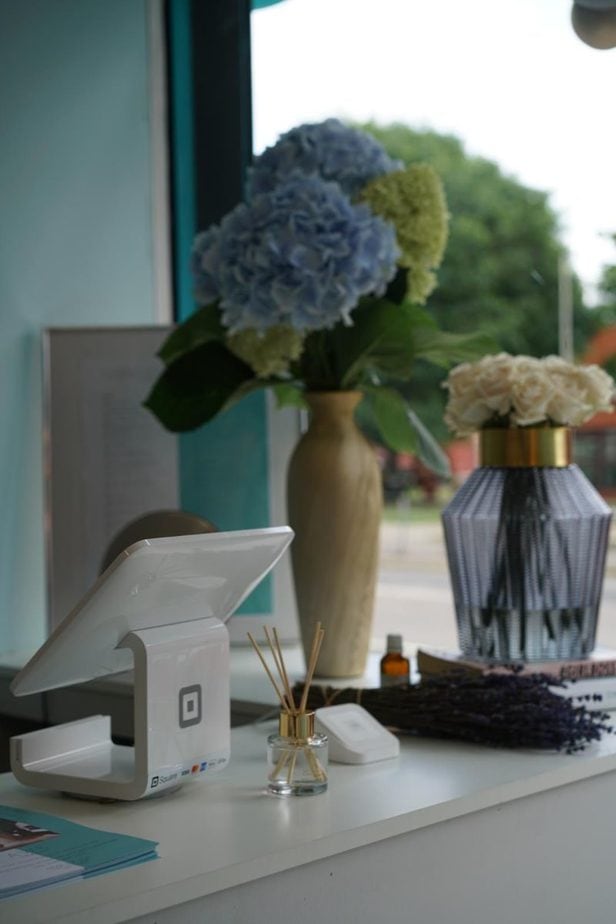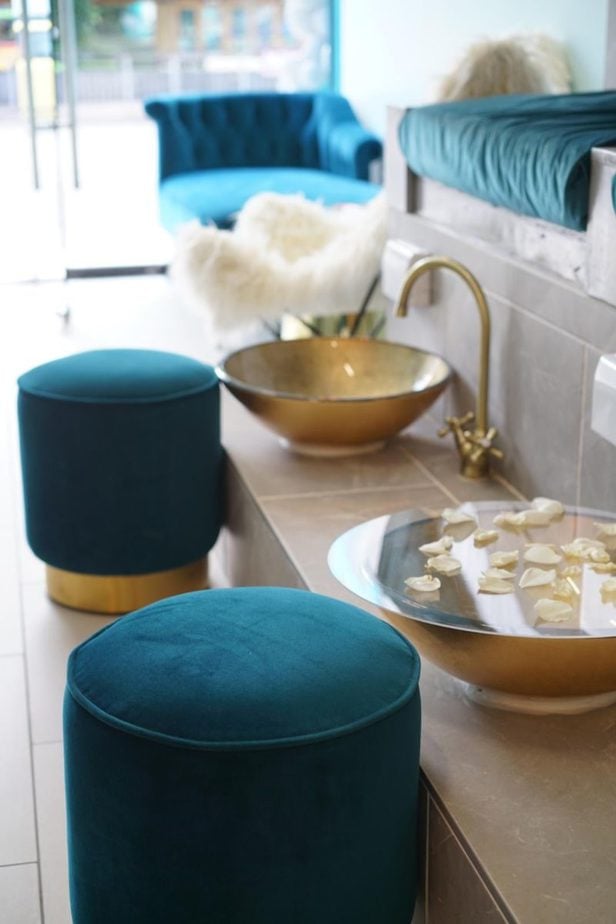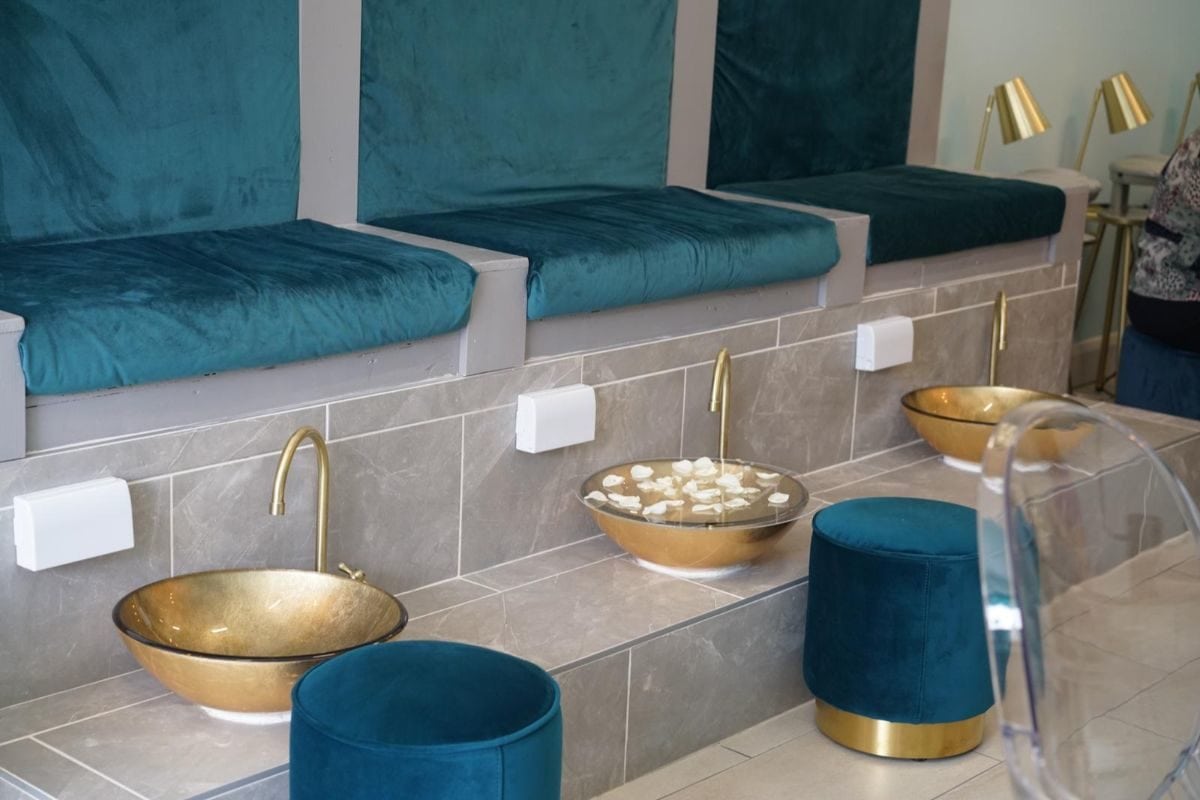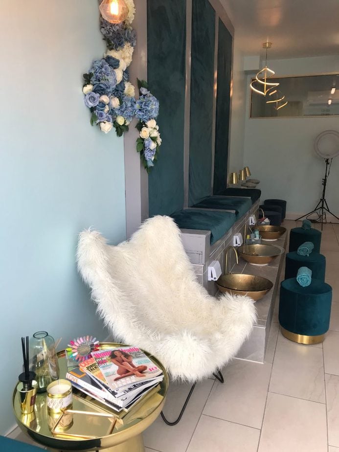 “I wanted the salon to have a fresh, classy and clean feel. Our décor combines soft blue walls, teal velvet furniture and dreamy flowers throughout. Clients have told us they feel pampered and relaxed thanks to the calm tones.”