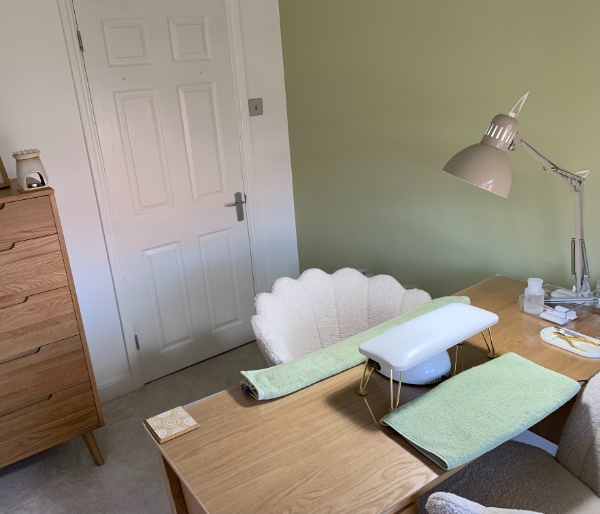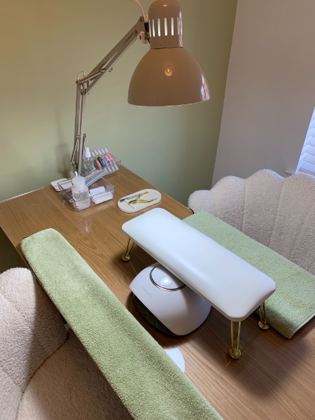 “My nail desk is solid wood and I have a matching chest of drawers to go with it. The desk is one I bought for doing my teaching paperwork, but with the help from my dad, we cut a hole out of the back, so that two people can sit at it,” she says. “I’m so glad I bought some acrylic to protect the top, as my acetone drips would have destroyed the wood on my desk by now.