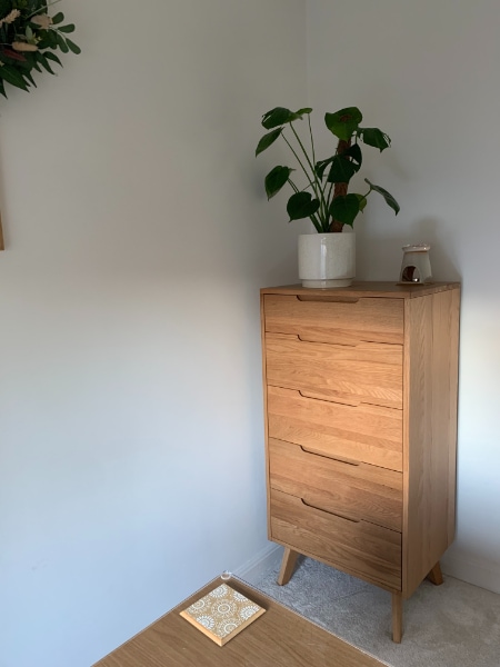 Georgia invested in making her salon of utmost comfort for her clients. As it is only her who works at the salon, she is able to create one-to-one experiences with her clients, encouraging comfort. To create a calming vibe, she chose wooden furniture and calming shades, such as white walls and ceilings with one khaki green feature wall for a pop of colour, alongside a cosy cream carpet.