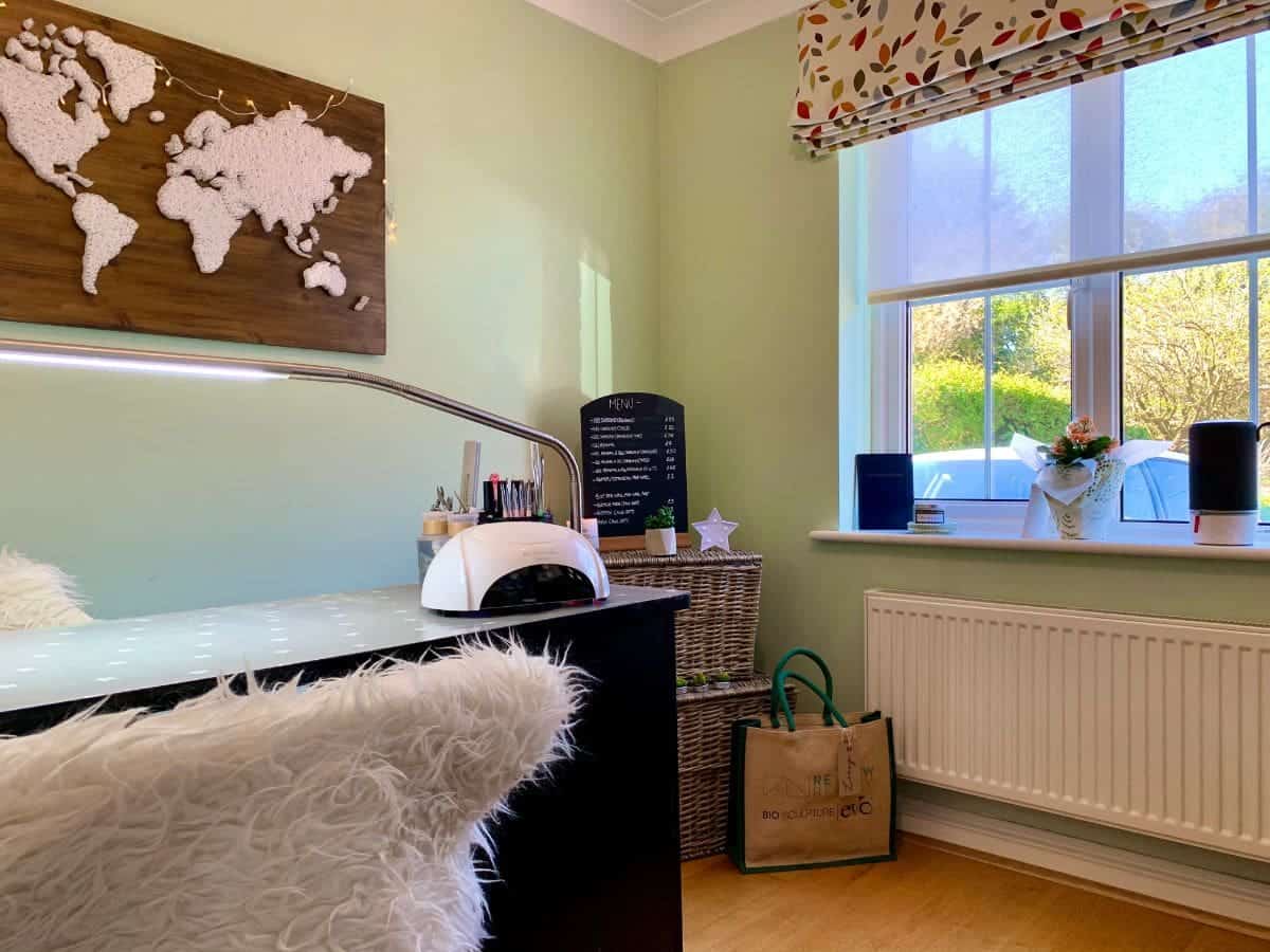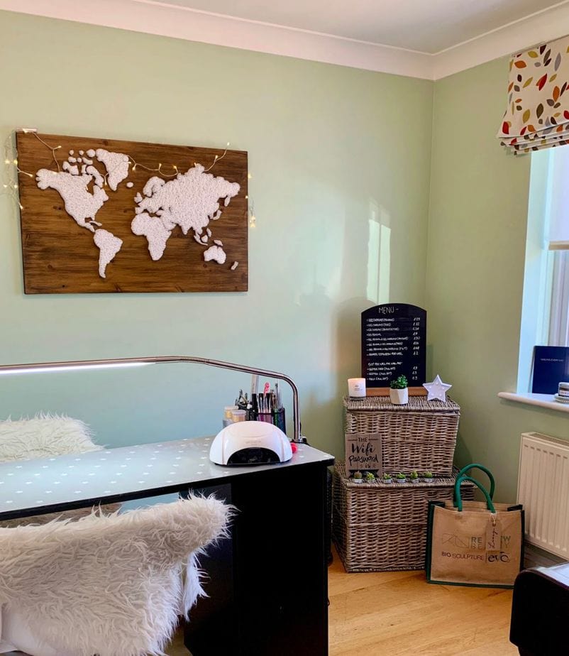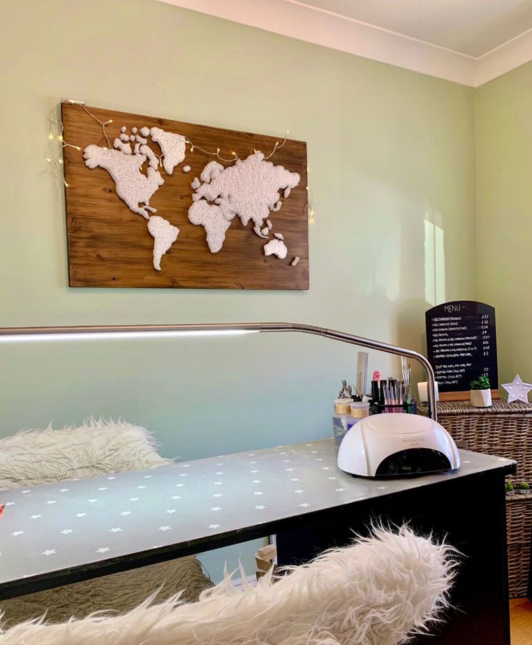 Welcoming with washes of sage and warming natural tones, the workspace has provided the ideal space for clients and fellow techs alike. “I love my work space,” Lizzie reveals. “I enjoy putting my artwork around the salon: I created the world map using string hanging above my nail desk.