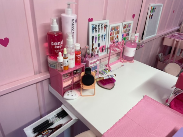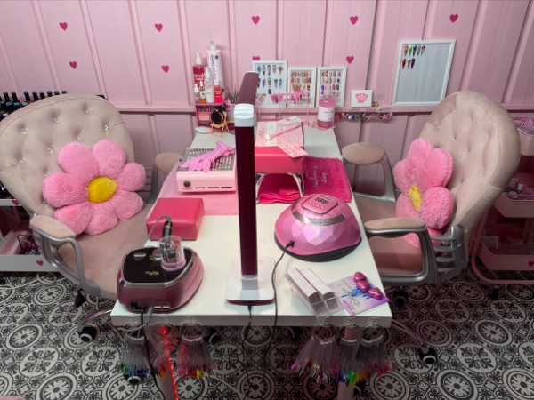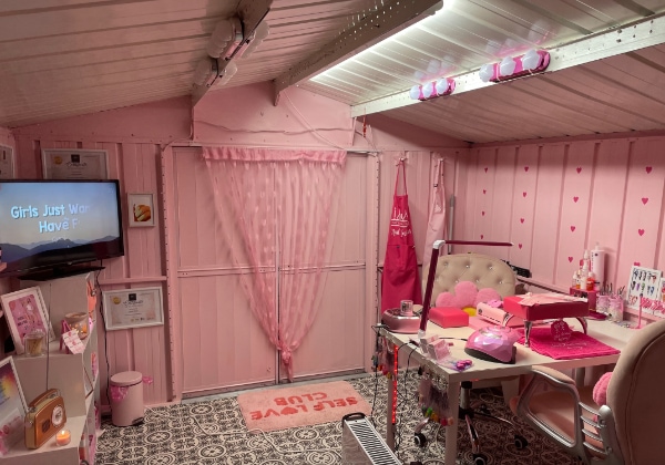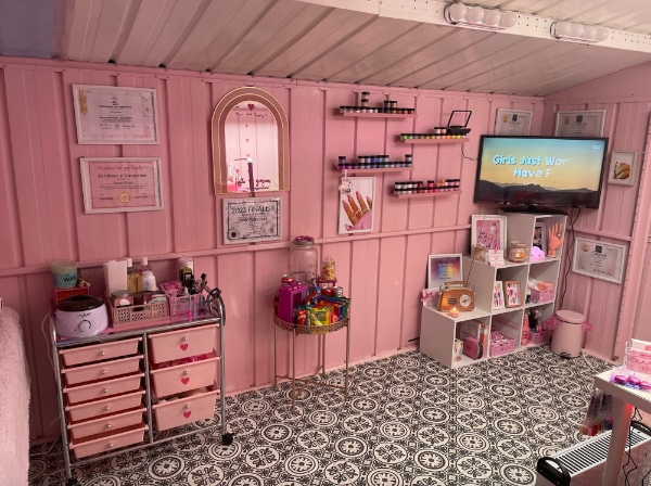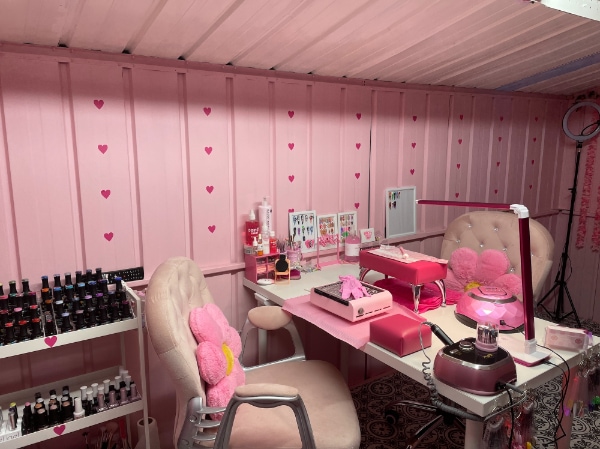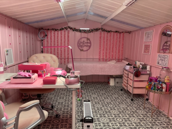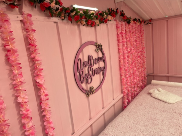 Starting out Nail Licious By Stacey at her living room table while alongside her other job, Stacey offered treatments to family and friends while she established her business. “My family helped transform our outhouse shed slowly into my dream pink palace, which I officially opened to clients in February 2022.