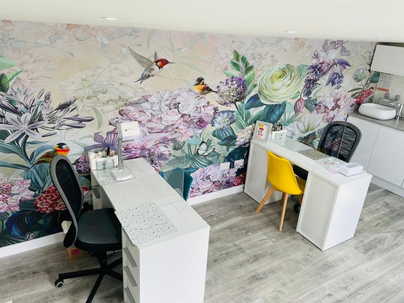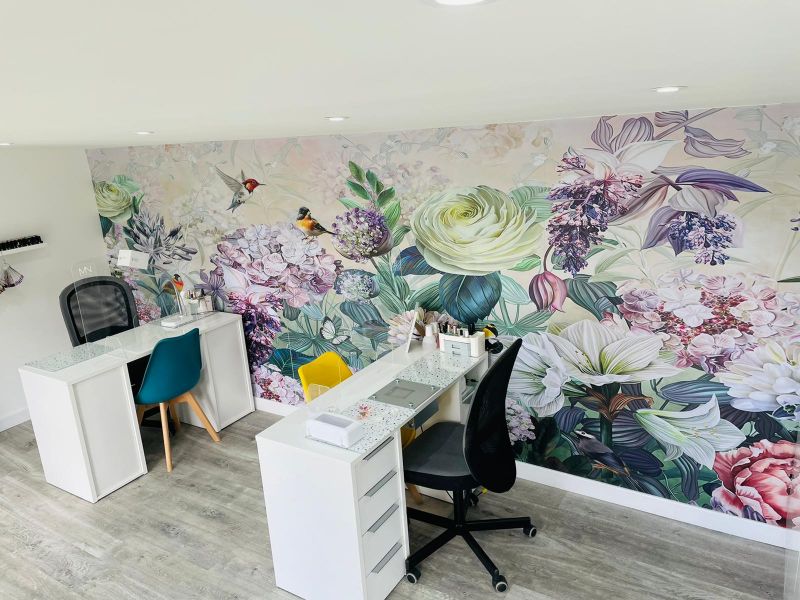 Now, a stunning studio can be found, complete with a décor that brings the great outside in. “It’s very fresh and airy, with lots of natural light,” Corey smiles. “All the walls are bright white and there is a mural feature wall that’s full of flowers, birds and butterflies.”