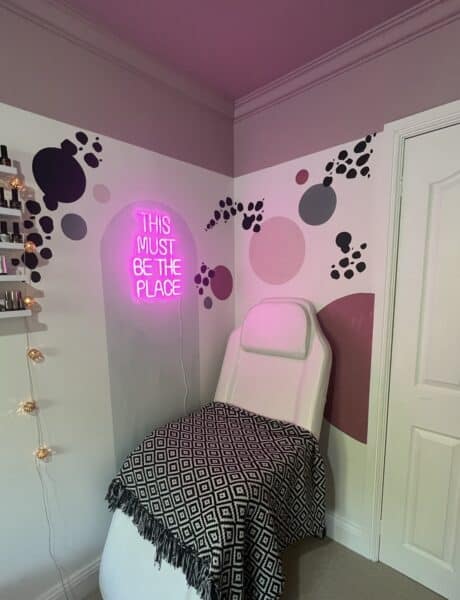 The decoration of Nails With Kails took around three weeks, with Kayleigh doing this between clients, working full-time and planning her wedding. “It was a labour of love,” she says. “The theme includes my favourite colours and there is a focus on abstract details, as this is my favourite nail art to create on clients and Dalmatian print has a special place in my heart! I have to admit, I was incredibly nervous when painting the ceiling, as I’d never done anything so adventurous before and the paint appeared brown at first. However, this turned out lovely and is one of my favourite parts of the salon.”