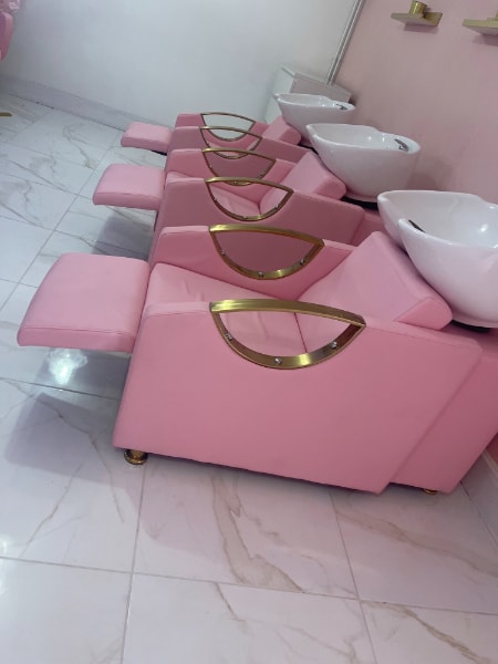 “We have a large pedicure station to seat three people, where we offer high tea pedicures with Prosecco and cocktails. Our bespoke hair stations are pink leather styling chairs with reclining wash back stations for the ultimate pamper.