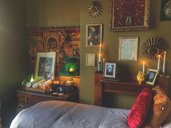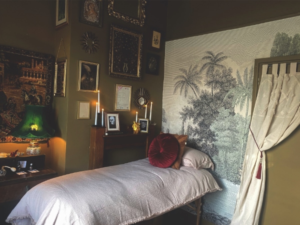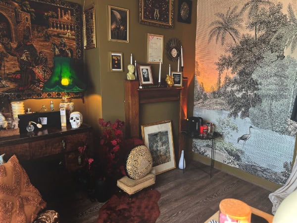 Transforming a plain grey office space into a moody maximalist nail studio carefully curated with curiosities, oddities and antiques, April Kitson wanted to reflect a dark academia aesthetic through her salon décor.