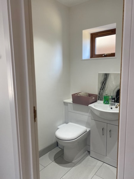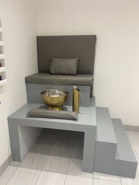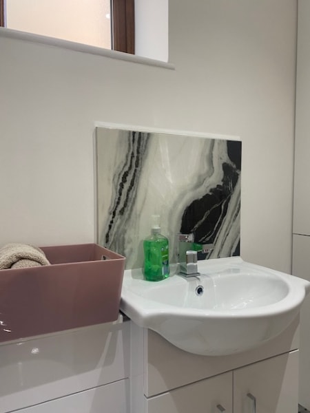 “I opted for white and grey décor with pink and gold accents. I’ve gone for a luxury design with the tiles on the floor, and we have underfloor heating as well as Anthrosite radiators on the wall. I chose marble splash backs on the two sinks, and a pedicure throne with an antique gold pouring jug and bowl for the feet to soak in.