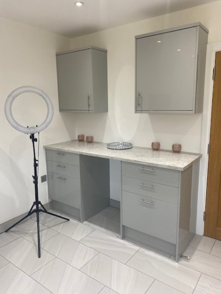 “It’s all exceptionally clean looking in my salon. It is quite clinical but very comfy and my clients just adore it. It’s show-stopping and unlike any other,” Rosanna enthuses. “It has been made to measure and helps me stay efficient as there’s so much space, which has allowed me to make different areas including ones for make-up, skincare, manis and pedis. It overall looks and feels very professional.”