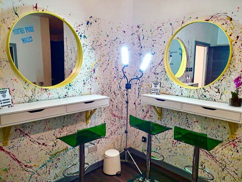 “As you make your way to the back end of the salon, we have so many cool wall features to look at – the Trainspotting quote at the makeup waiting area, quirky paint splashes on the three makeup walls, and a patriotic set of angel wings hand painted by the very talented @Devoartrocks on Instagram.