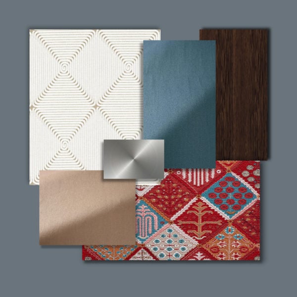A mood board exploring colours, patterns & textures for an interior project by Haz Dean