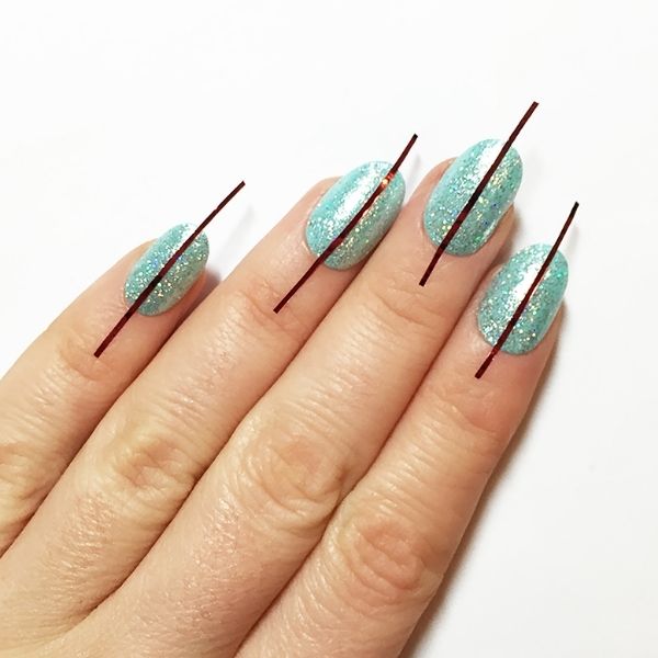 When the nails are dry, apply striping tape down the centre of each nail and press firmly.