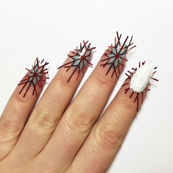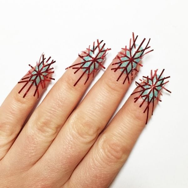 Using tweezers, lift off the striping tape. Take off the ‘V’ shape branches of the snowflake first, then take off the piece of striping tape that you applied last and the piece before that, and so on. If you don’t follow this order, you will pull everything up and ruin the design. The polish should be slightly wet when you remove the tape to give a cleaner finish to the lines.