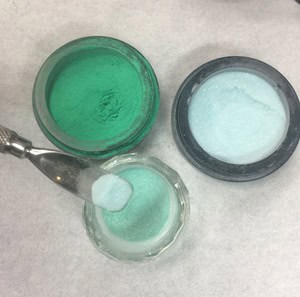 Glitter can be mixed with clear or coloured acrylic powders. Remember to work to a 3:1 ratio of acrylic powder to glitter or pigment. If you use too much acrylic powder, it will overpower the glitter or be too transparent if you use clear. If you use too little acrylic powder there will be no strength to the product.