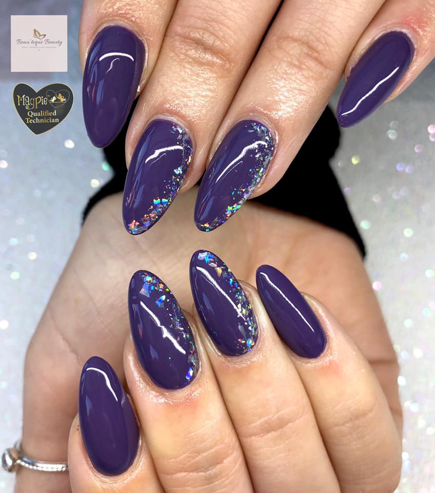 “I designed these nails using Magpie Beauty Gel Colour in Tasty Tina, which is a gorgeous grape shade and the amazing Magpie Beauty Starla holographic flakes, which I gently dabbed around the side of the nails.
