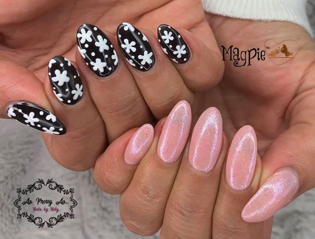 “I created these nails using Magpie Beauty products. The florals were inspired by the spring/summer season and I’ve seen so many fantastic floral designs out there on social media and wanted to create some of my own. However, I wanted to go a little bit more simple with my design so opted for little flower shapes without any detail. I used Magpie’s Black Betty Gel Colour for the base and wiped away the inhibition layer to achieve a matte surface to work on. I used their White Gel Paint to draw on the flowers using a dotting tool. To create them I added five small dots and dragged the gel paint towards the centre so as to create individual petals – something I found a little easier as I was using my non-dominant hand. I decided against adding a top coat as I quite like the subtle texture it created. For the pink nails, I used Magpie Gel Colour in Good Golly Miss Molly and sugared Magpie Beauty Glitter in April from the Birthstone collection over the top. My intention was to add a top coat but the beautiful shimmery effect achieved by just sugaring was amazing so I kept it there.