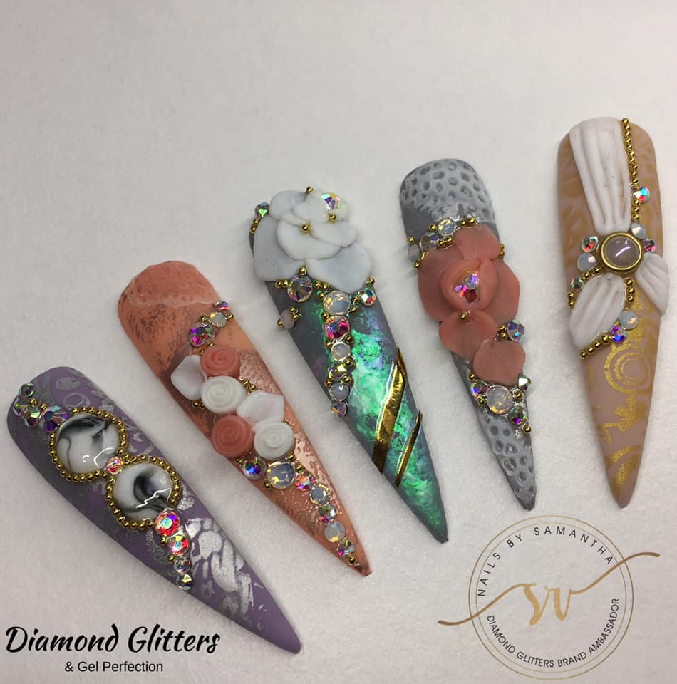 “I created the nails using a variety of products including Gel Perfection Gel Polish from Diamond Glitters. I used Gel Perfection Make It Velvet Top Coat for the finish of the nails, as this gives a lovely cushioned effect. I also stamped a subtle pattern on the nails using MoYou London Stamping Polish. For the 3D elements I used 4D gel, as it gives you plenty of time to work with it and create the design you wish. The designs are finished off with crystals and opals to give that special look. In parts of the design I also used Rainbow Flakes and Gold Striping Tape from Diamond Glitters.