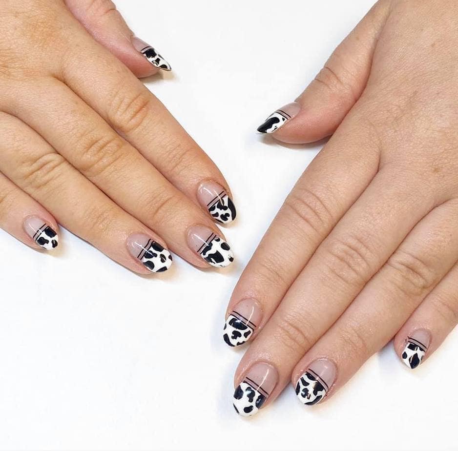 Chelsea Tipper, of Beauty by Chelsea at Aspire, wears an on-trend cow print nail design.