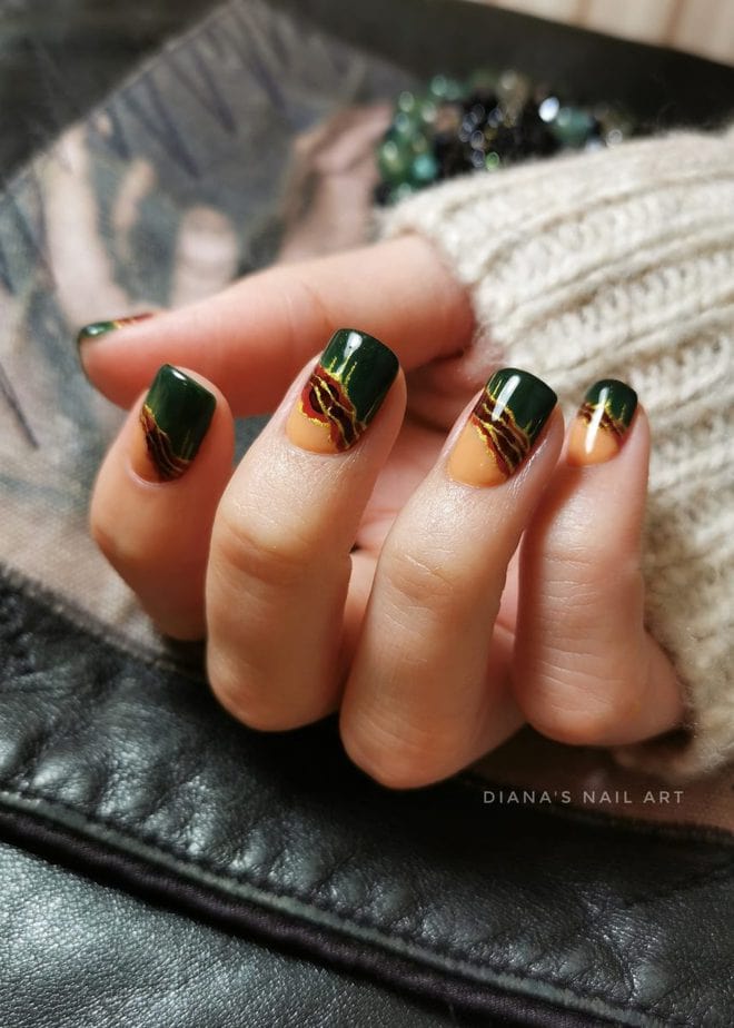 “I love a nice DIY project, so Pinterest can be a real treasure box when it comes to looking for new ideas. I saw an interesting three-colour gradient pattern that someone created on the wall and immediately thought I’d love to create something along those lines on my nails, but using an autumnal colour palette of dark green, pumpkin and burned caramel shades.