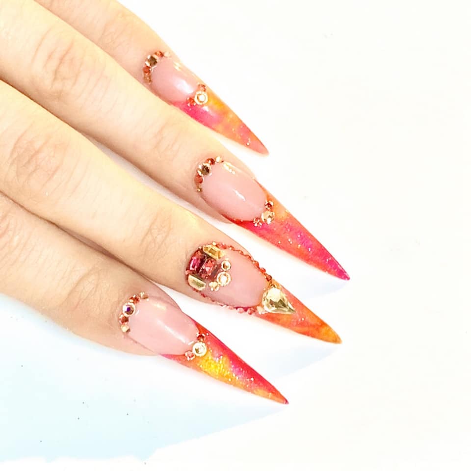 Elysia Harmony, of Elysia’s Harmony Nail Artistry & Education, wears fiery red and orange enhancements.