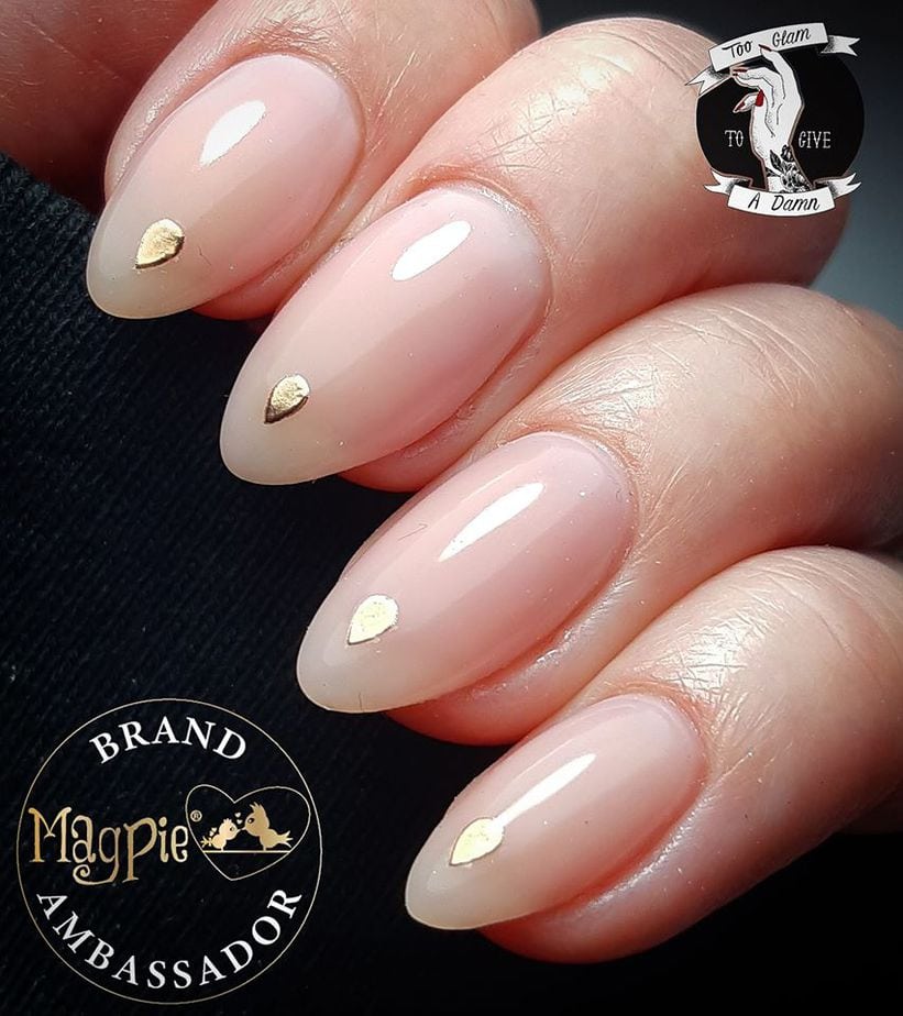Hannah Leahy, of Too Glam To Give A Damn, wears a sheer nude nail look with gold accents.