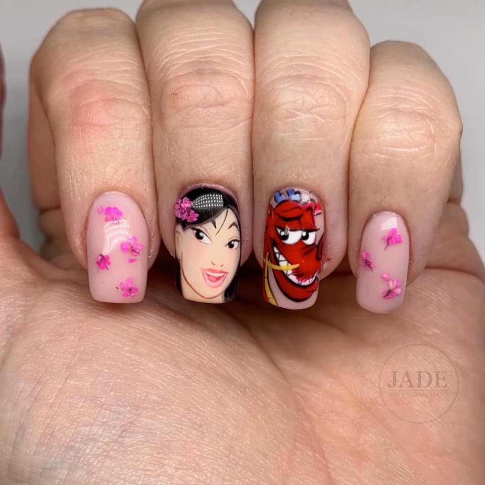 “Once that’s done, I go in with the facial features curing bit by bit as I go, then finish off with the outlines. I used this same process with Mushu to create his design. I then went and painted the rest of my nails with The Gel Bottle Inc in Diana and, while the second coat was wet, I placed in some small pink dried flowers to give a cherry blossom effect, also putting one in Mulan’s hair as a little hair accessory. I then encapsulated these in BIAB Clear to ensure no lumps and bumps and finished off with Extreme Shine Top Coat.