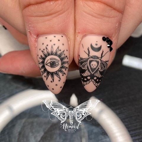 “I was inspired to create these nails because I wanted something simple with no glitter for a change. I love anything witchy/occult and I have several stamping plates by MoYou London that I haven’t had the chance to play with much.