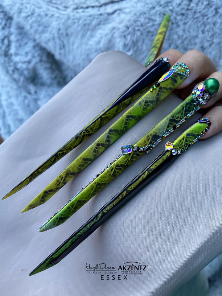 Talented tech, Kayley Cairns, wears extreme nails seeing a patterned green design adorned with Swarovski Crystals.