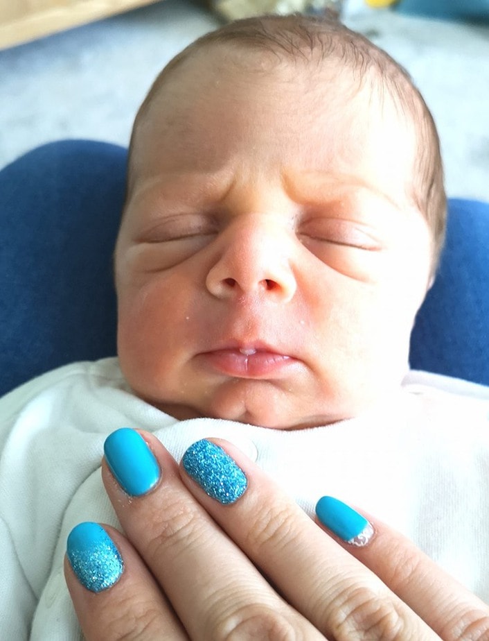 Kelly Wells, of Beauticle Nails, wears blue nails after the birth of her baby boy.