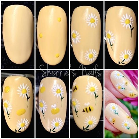 “I’ve always loved pastel yellow nails but personally never been brave enough to wear it… Lockdown gave me the opportunity to try it and I love it! I will definitely embrace these shades more often. Being springtime with lots of daisies and bumblebees around, I thought it was a great nail colour to pair with this design.