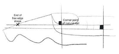 To calculate this precisely, we still work with a right angle, but we measure this from a different place. A straight line and therefore the side wall need to extend from the corner point of the natural nail to the end of the free edge shape.