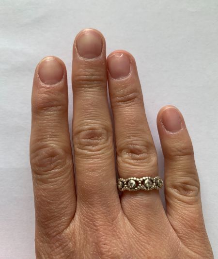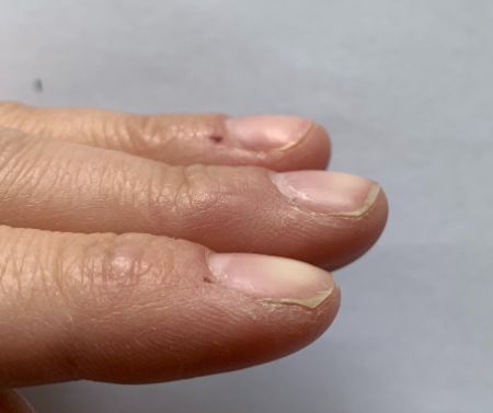 Typically, the index fingernail tilts downwards; the middle fingernail tilts a little less downwards and the ring fingernail tends to be straighter.